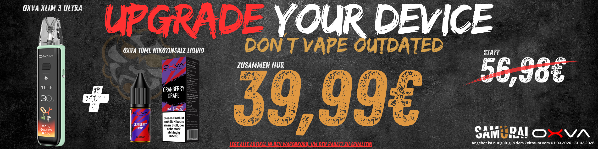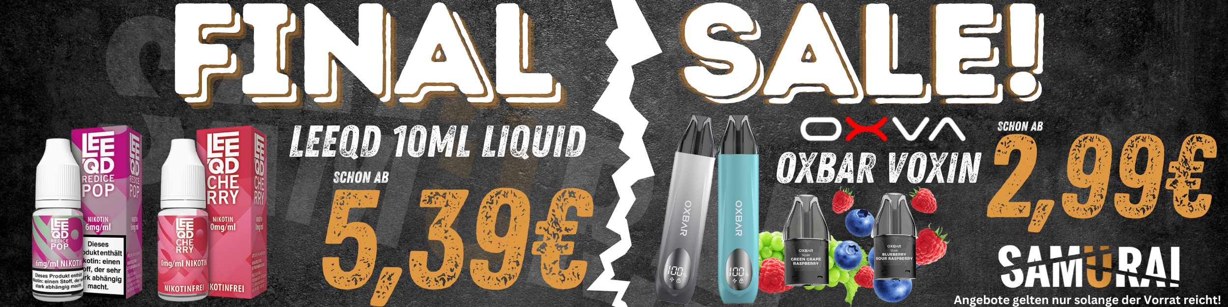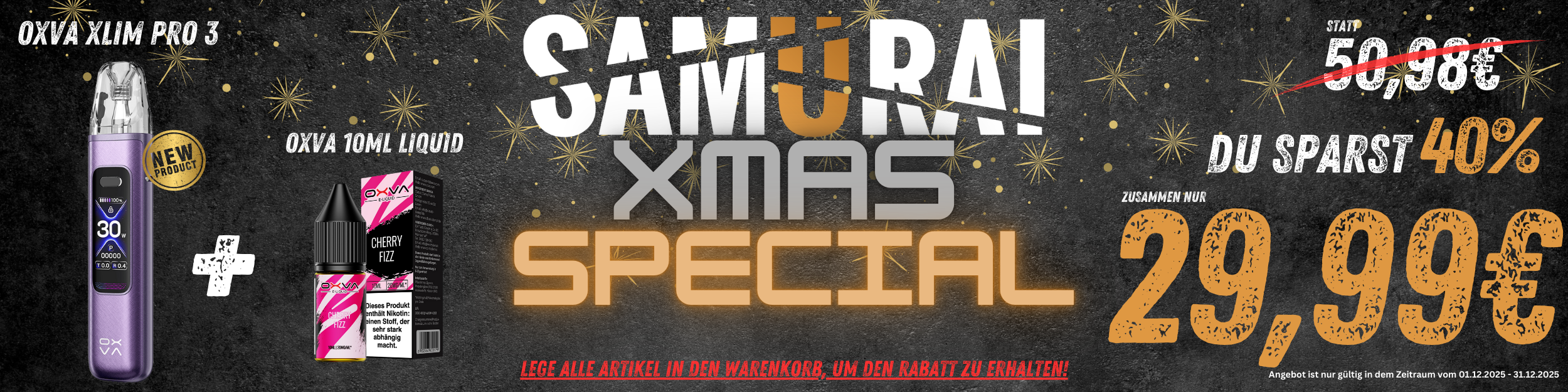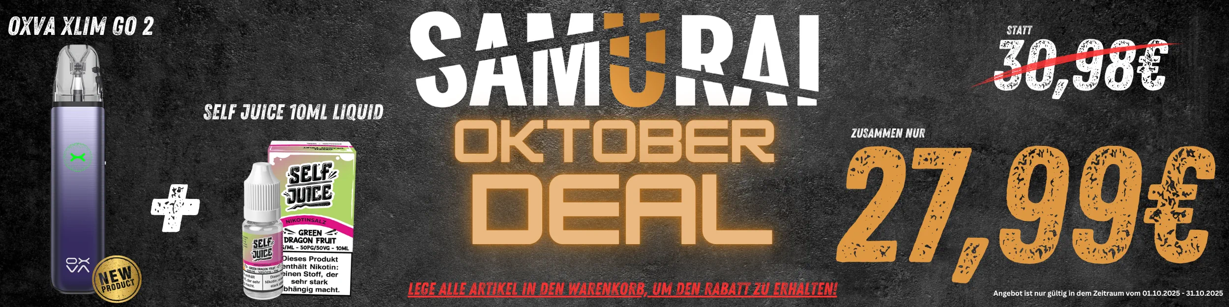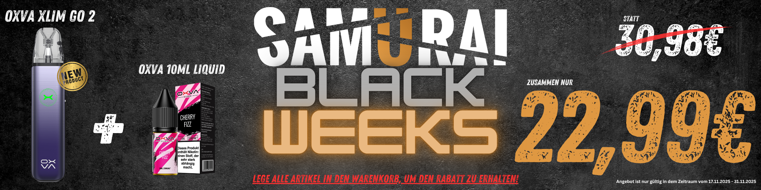 Im SAMURAI Sale findest du jeden Tag zahlreiche reduzierte Produkte mit 20%, 30% oder sogar 50% Rabatt. Zum Beispiel E-Zigaretten, Startersets, Podsysteme, Kits, Mods, Verdampfer, Coils und viele weitere Artikel. Mit den SAMURAI Special Offers sparst du sogar noch mehr: Hier spendieren wir dir zu deiner Bestellung (z.B. Liquid, Aroma, Base, Longfill, Shortfill, Nikotinshot oder Nik-Salz) eine Portion gratis. Lege zum Beispiel fünf 10 ml Aromen in deinen Einkaufswagen, bezahle aber nur vier. Das Angebot ist dauerhaft in unseren SAMURAI Stores verfügbar und bald auch in unserem SAMURAI Online Shop.